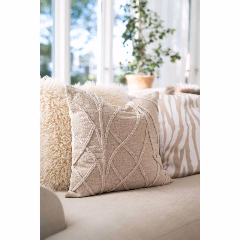 Ett kuddfodral i naturfärger ger en lugn och harmonisk känsla till din inredning. På framsidan är det flätade rep som snyggt snurrar sig runt varandra. Dessa flätningar ger en rustik charm och enda gjort intryck.