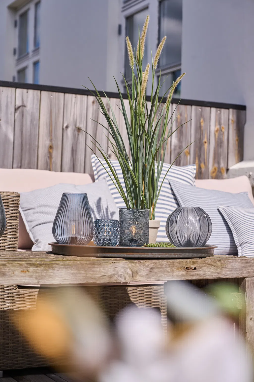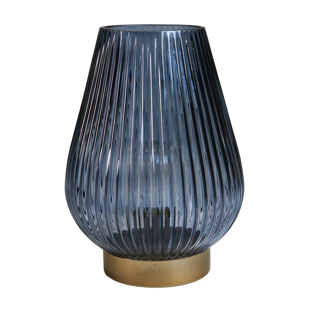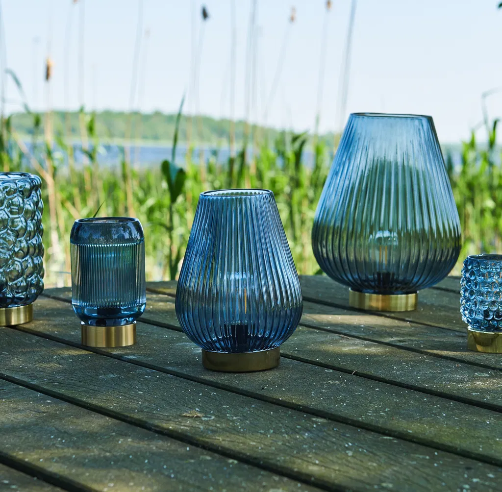 Ge ditt hem en varm och stämningsfull känsla med denna vackra blå glaslampa med LED. Den djupa blå nyansen sprider ett mjukt och behagligt ljus som blir en elegant detalj på bord, hylla eller fönsterbräda.