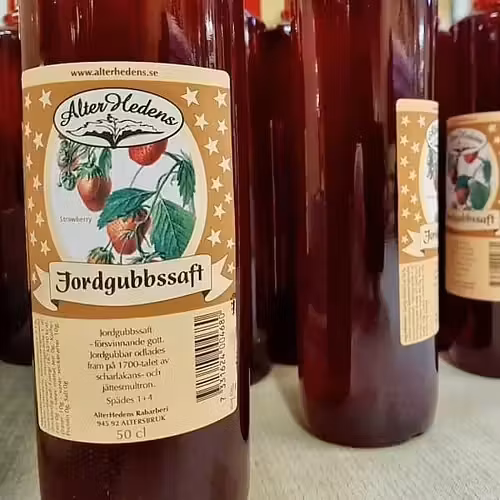 Jordgubbssaft är försvinnande gott! Jordgubbssaft passar till fika och hör sommaren till. En saft från AlterHedens Rabarberi är barnens favorit och en god delikatess. Äkta Jordgubbssaft med mycket bär är smarrigt god. Den är förpackad i vacker hög glasflaska med svart hätta. Jordgubbssaft är koncentrerad och späds med fyra delar vatten. Förvara den i rumstemperatur. Jordgubbar är egentligen en korsning mellan scharlakanssmultron och jättesmultron. Jordgubben kom till Sverige på senare delen av 1700-talet.